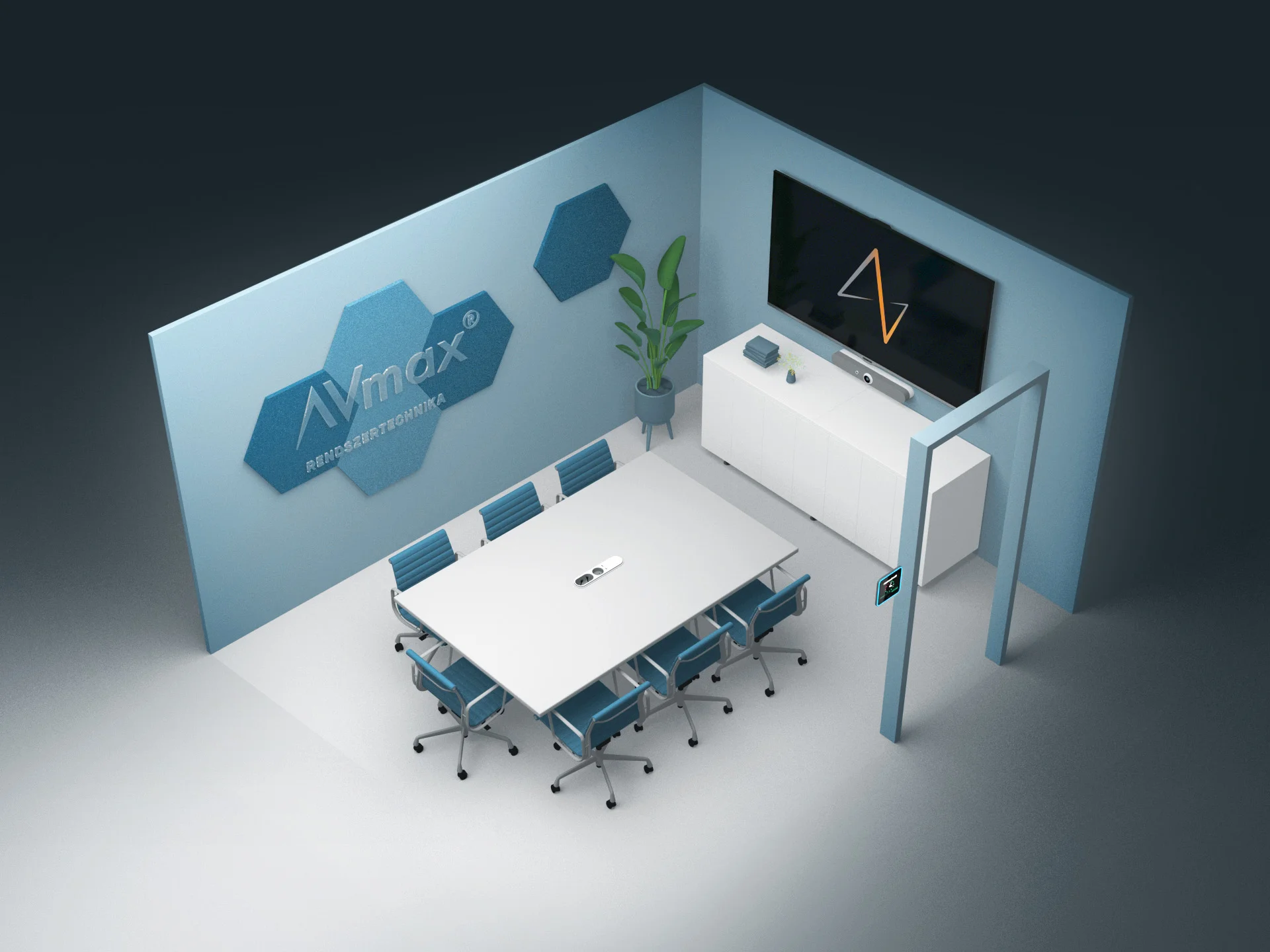 Az akusztikus panelek feladata a terem oldalfalairól visszaverődő hangok csökkentése, javítva a videókonferencia hívások minőségét: „teres hang” megszűntetése.