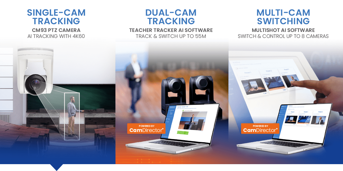 Nagylátószögű és magas zoom tartománnyal ellátott vezérelhető PTZ kamerák, előadókövető funkcióval.