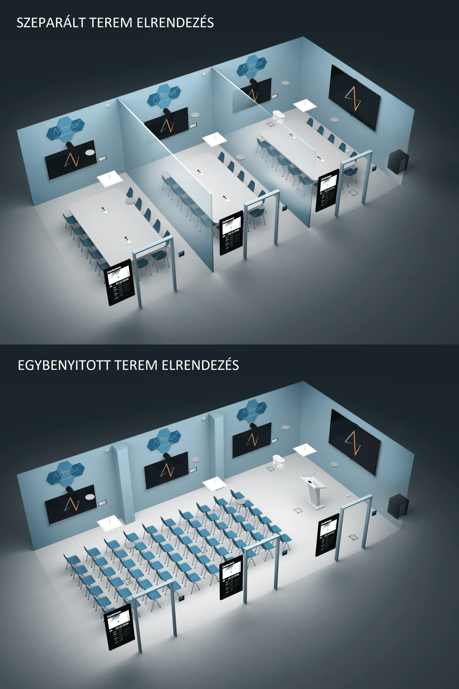 A szekcionálható konferencia vagy tárgyalótermek az online/offline megbeszélések, oktatások helyszínei. Egyszerre alkalmasak kislétszámú 6-12 fő és nagylétszámú 20+ fő befogadására. Általában kettő, illetve három terem egybenyitásával érhetünk el nagyobb közönséget kiszolgáló tereket. AV technikai oldalról mind a szeparált üzemmódban, mind az egybenyitott üzemmódban biztosítani kell az audio, video és videokonferencia rendszerek önálló és együttes működését. Fontos szempont, hogy a terem bármely pontjáról ugyan azt a minőségi hangot és képet biztosítsa a meeting túloldalán levőknek/rögzítés során, mint ha ők is a teremben ülnének.